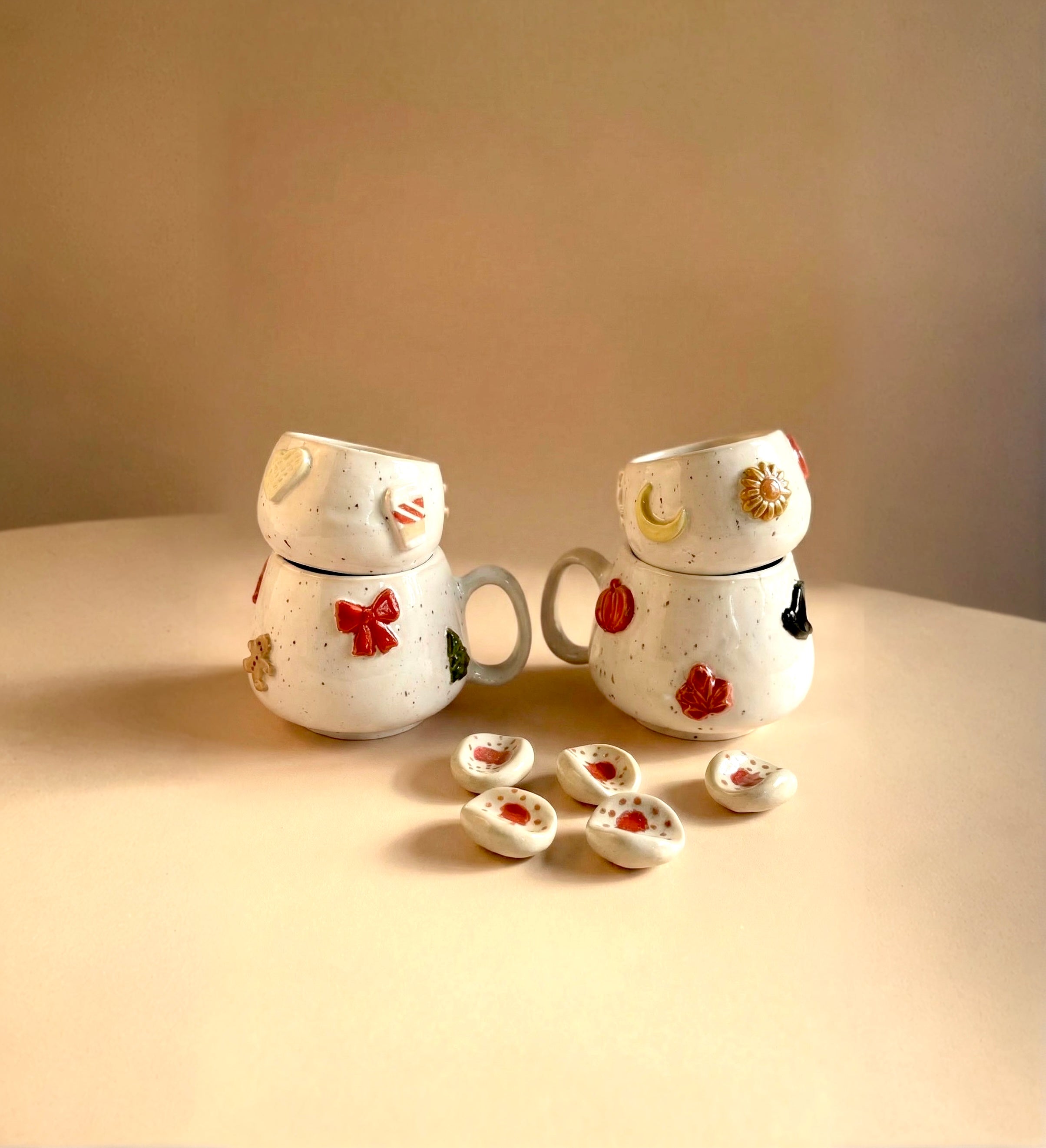 The Clayful Moments Collection is a celebration of whimsy, joy, and everyday delight in ceramic form. Each piece is thoughtfully handcrafted from speckled clay and adorned with playful details—think tiny croissants, waffles, and pretzels, cheerful shell motifs, or a bold stitched heart. Some mugs even surprise with a sculpted shell at the bottom, revealed only as you finish your drink. The collection blends tactile textures, fun shapes, and vibrant accents, making every mug and vessel a unique conversation starter. Designed to spark smiles and invite a sense of play into your daily rituals, Clayful Moments is perfect for those who love their ceramics with a side of charm and personality.