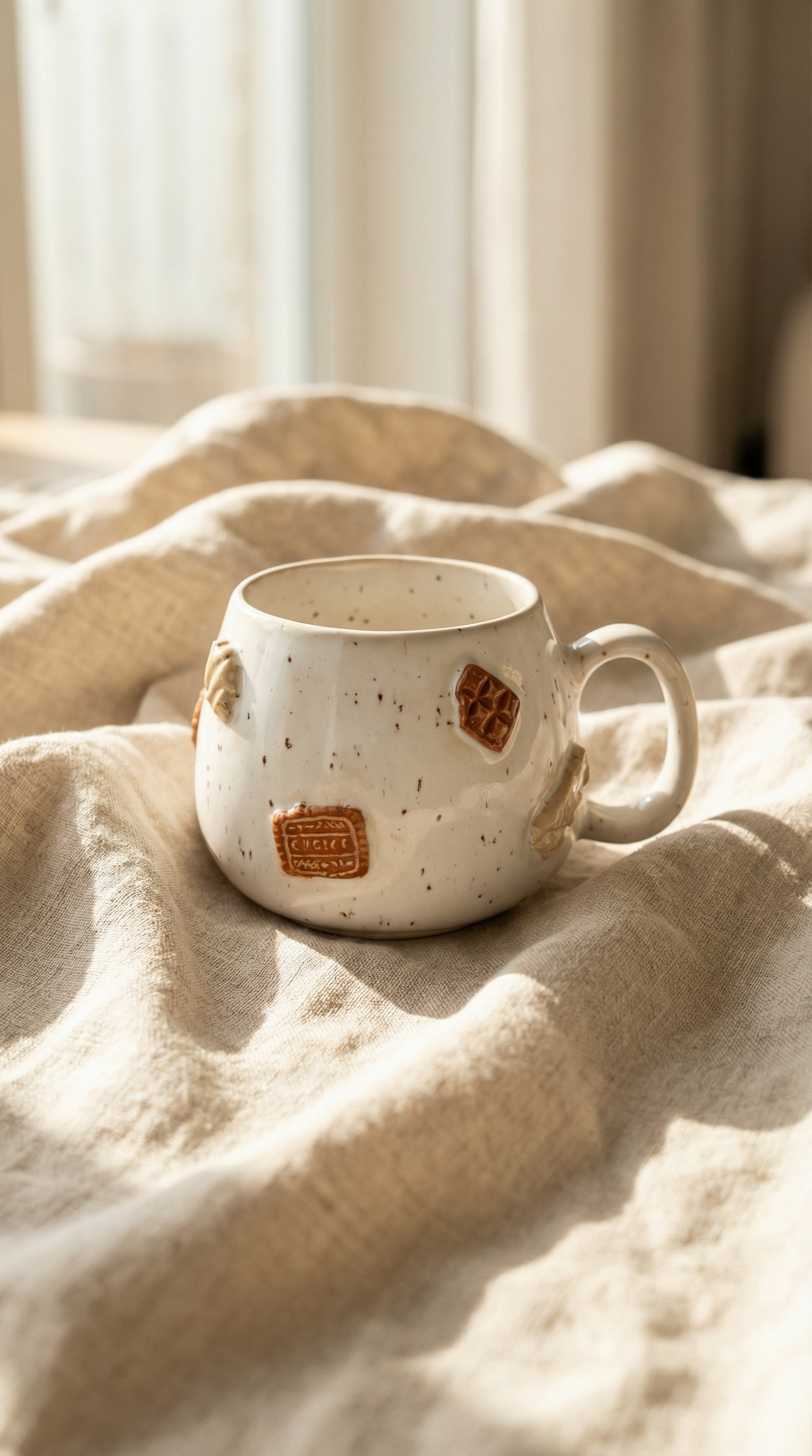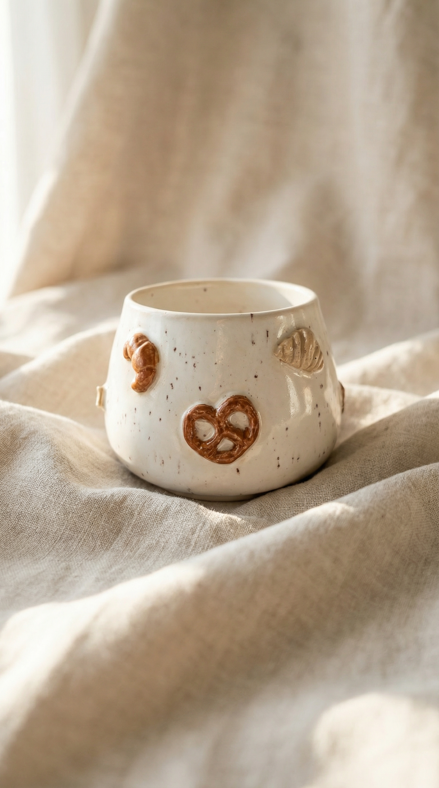 Le mug Croissant Club présente une forme arrondie inspirée des galets et une anse confortable. Fabriqué en argile mouchetée, il apporte une touche naturelle et artisanale. Sa surface est ornée de pâtisseries originales sculptées à la main – croissants, gaufres, bretzels et autres – soigneusement émaillées pour un rendu réaliste. L'association de la base mouchetée et des détails pâtissiers fantaisistes fait de chaque mug une pièce unique et joyeuse, parfaite pour égayer votre rituel café ou thé quotidien.