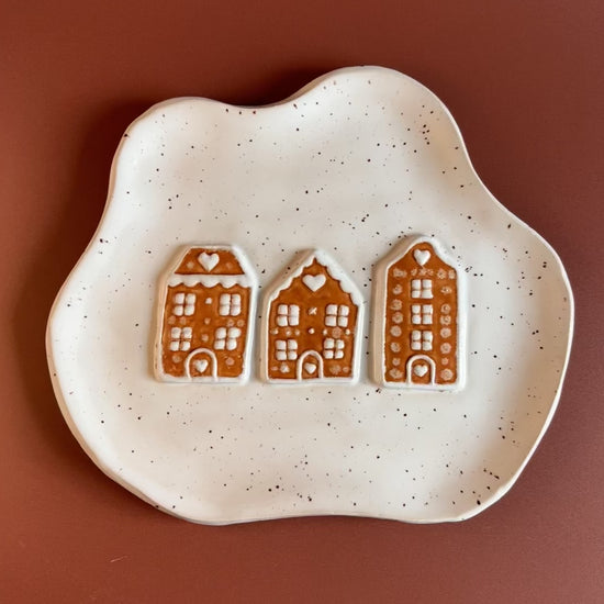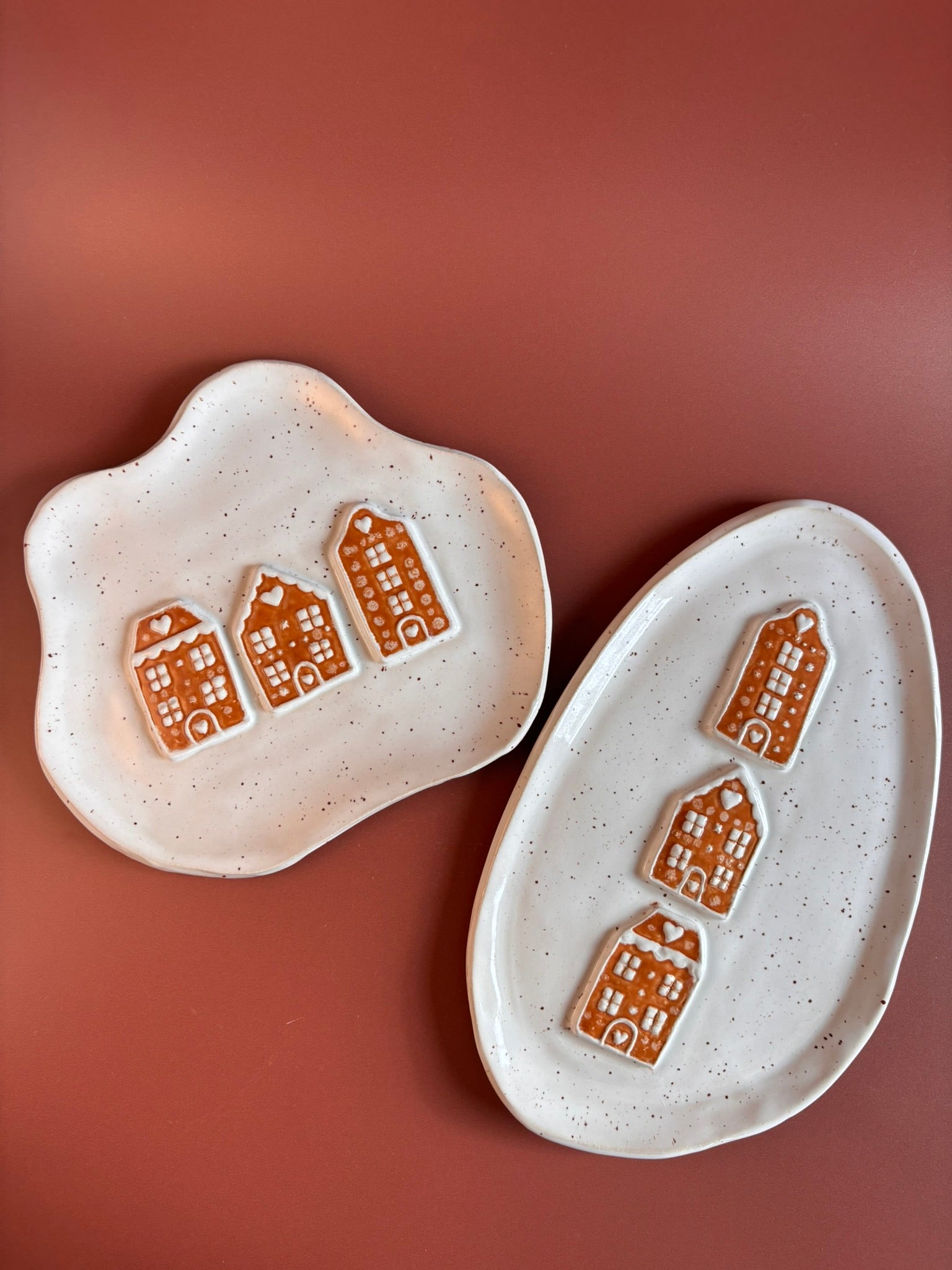 Celebrate the season with the Christmas Amorphe Plate, uniquely shaped to add playful charm to your table. Featuring hand-sculpted gingerbread house motifs, this organic, wavy plate brings warmth and delight to holiday gatherings, making every treat feel extra special. Perfect for cozy Christmas breakfasts, festive desserts, or simply sparking joy with its whimsical design.
