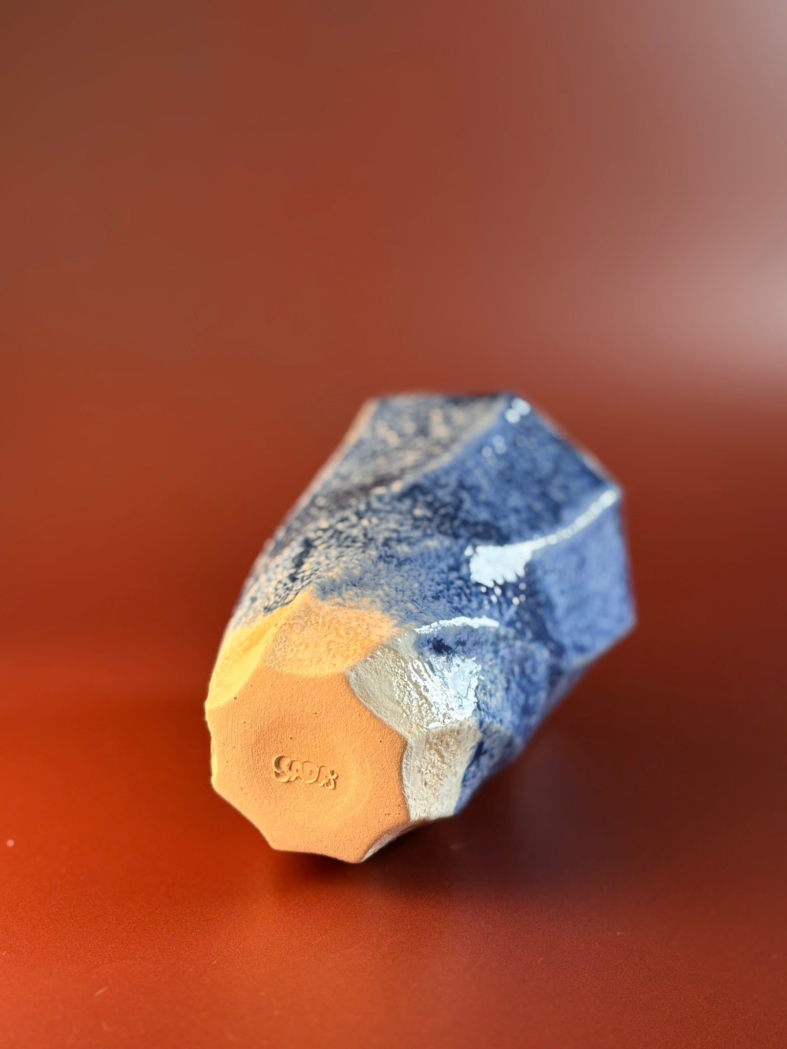 The Dark Ocean Mist · Diamond Mug is a handmade ceramic piece featuring a bold faceted shape, finished with a rich, deep blue crystalline glaze inspired by misty seascapes. Its generous size makes it the perfect choice for those who love a big cup of latte or a comforting large tea. Both sculptural and practical, this mug brings expressive, artisan-crafted style to your daily.