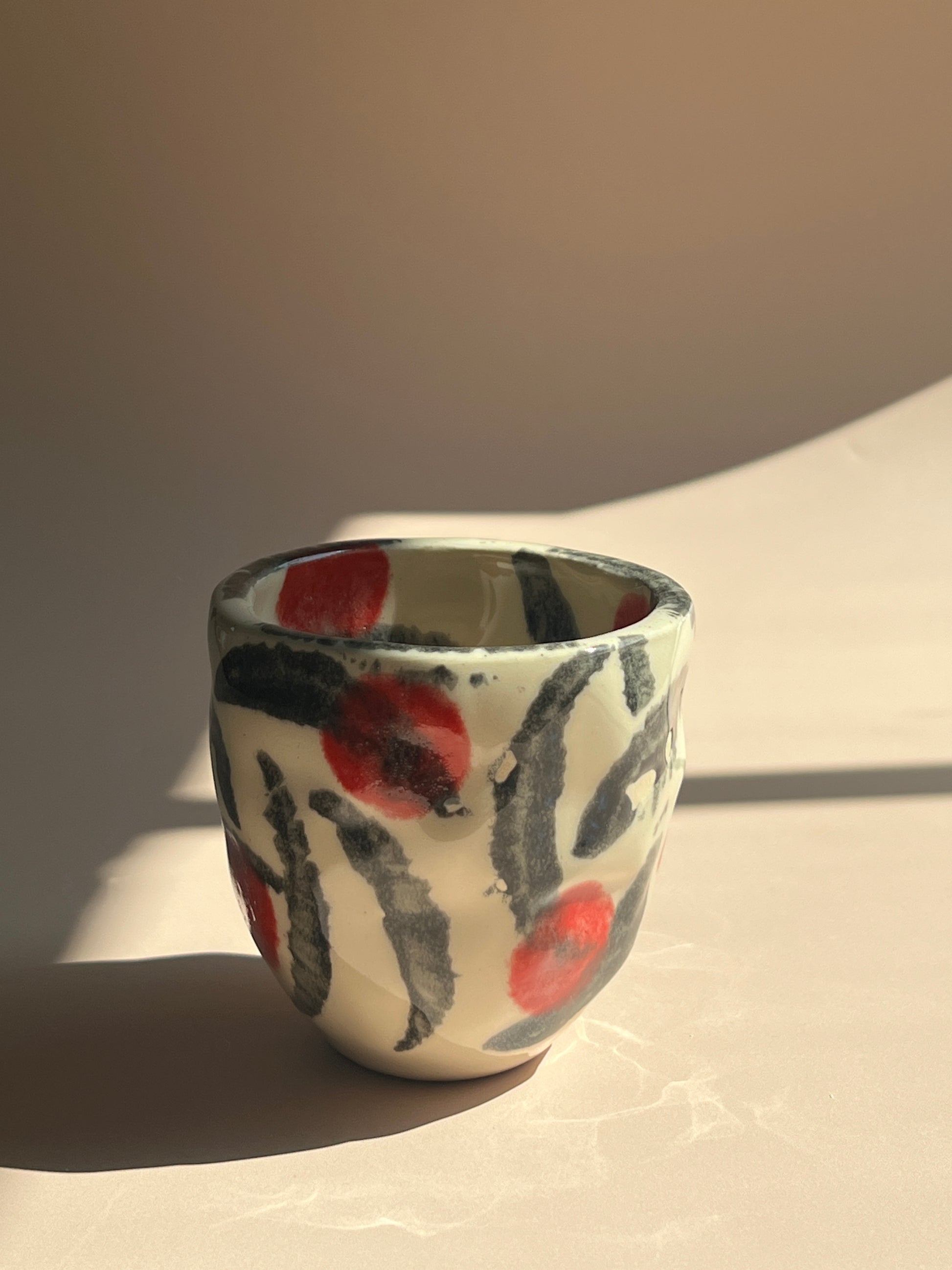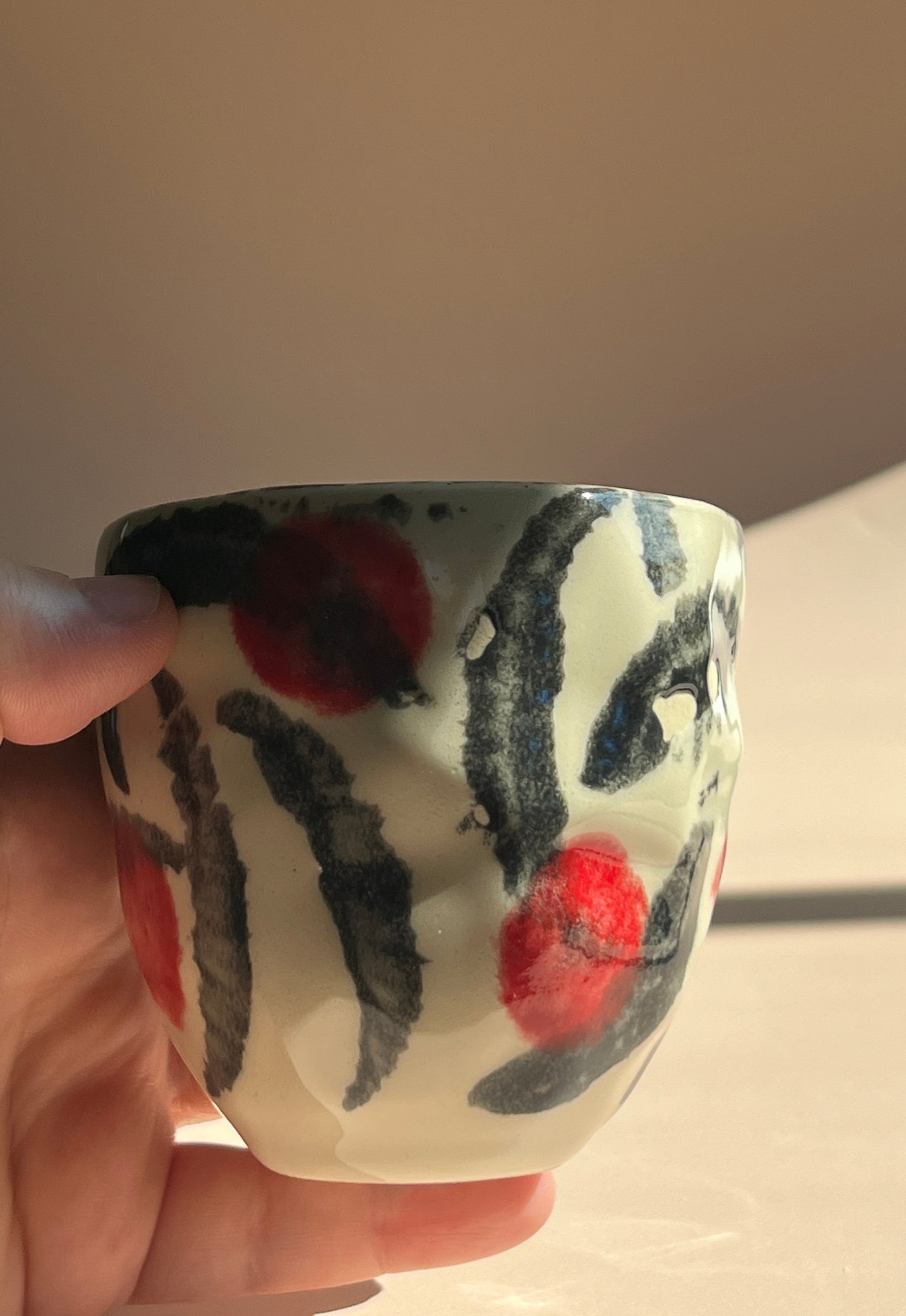 This Hakeme Cherry Stone Mug draws on Japanese hakeme brushwork tradition, featuring bold, hand-painted black strokes and vibrant cherry-red accents on a creamy clay base. Its amorphous, organically shaped form adds to its unique appeal—each mug is one of a kind, celebrating the beauty of imperfection and expressive artistry.