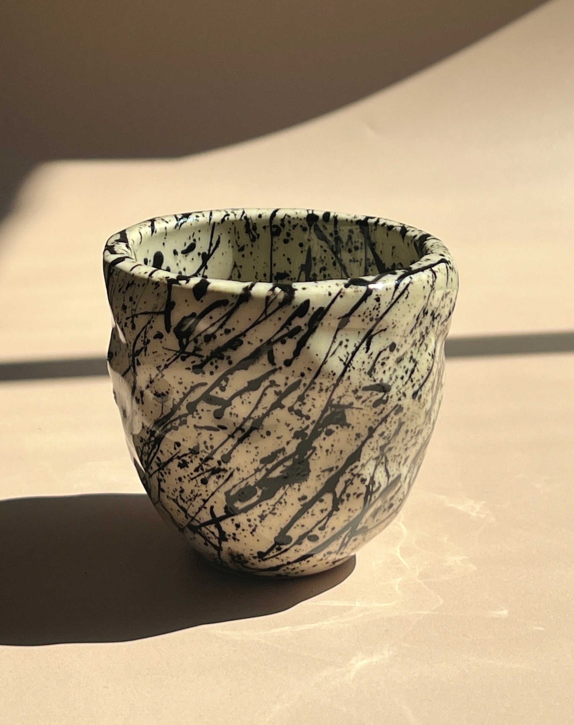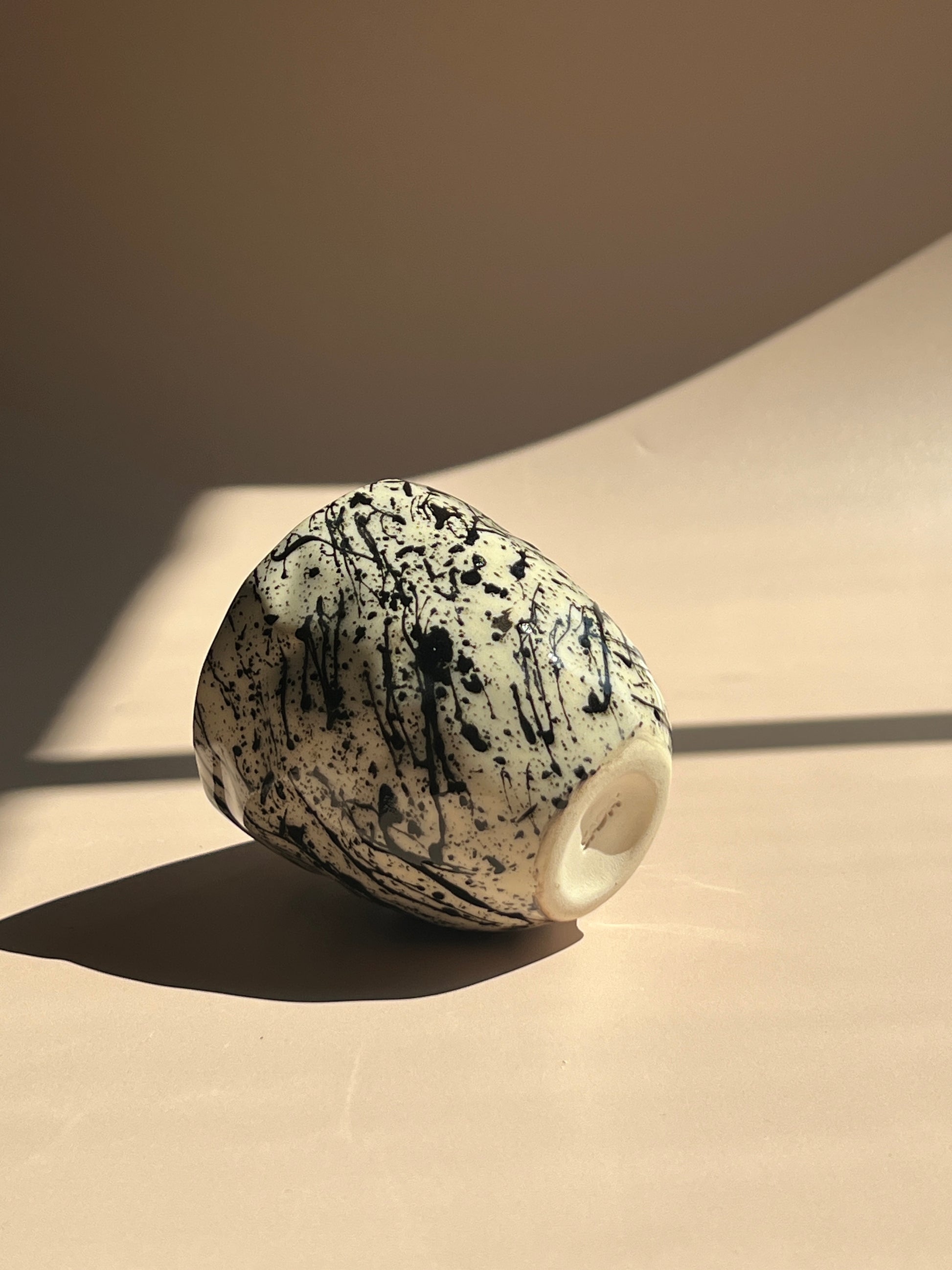 Noir Drip . Stone Mug features a unique, softly faceted form that feels organic and comfortable in your hand. Finished with a bold black splatter glaze over a creamy base, it embodies the signature look of the Noir Drip collection. Each cup is one of a kind—perfect for coffee, or tea, and designed to bring a touch of modern artistry to your daily rituals.