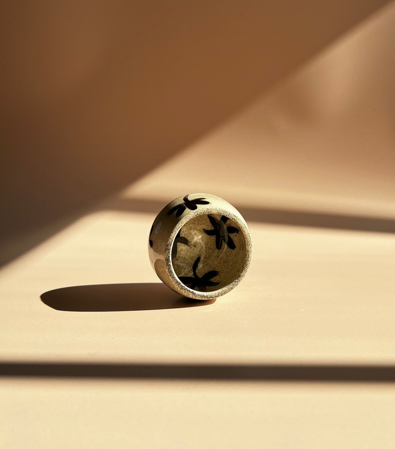 The Noir Petal Pebble Mini Mug features a softly rounded, pebble-like form crafted from speckled clay. Its surface is adorned with bold, hand-painted black petal motifs, creating a striking contrast against the natural, textured background. Compact and minimalist, this mini mug is perfect as a decorative accent or for serving small treats, bringing a touch of graphic elegance and handcrafted charm to any setting.