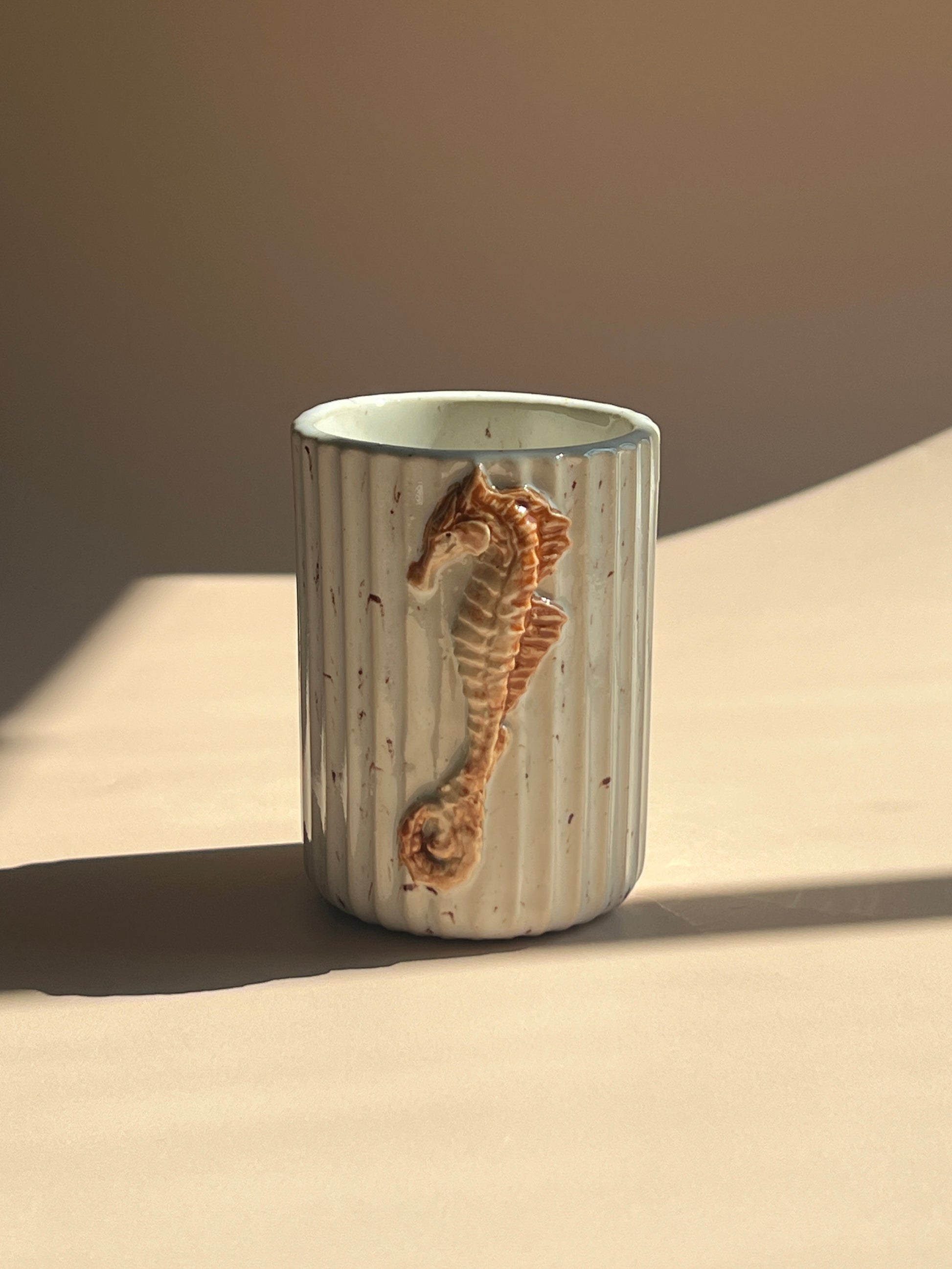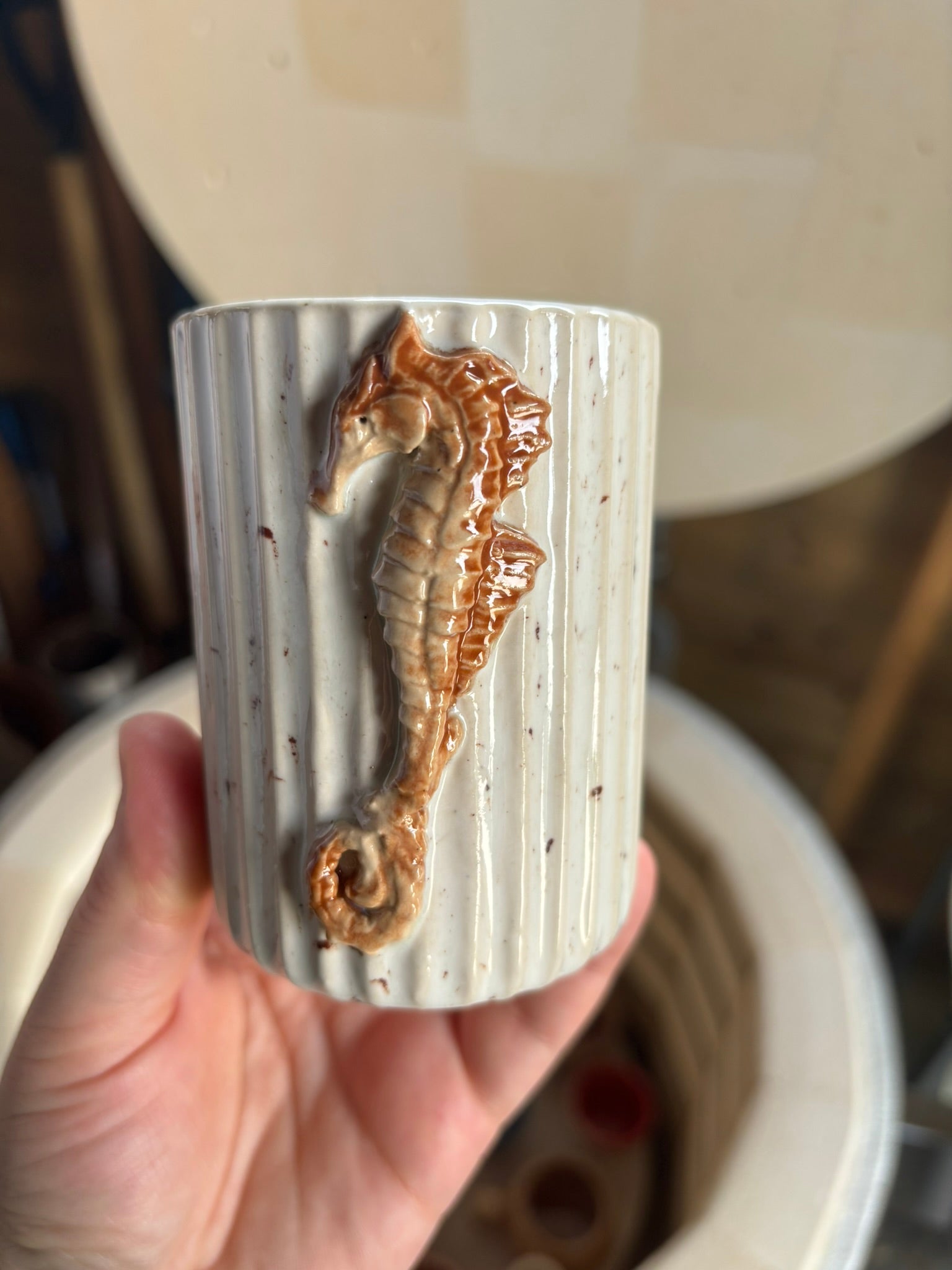 Bring a touch of the ocean to your day with this handcrafted ceramic mug, featuring a detailed seahorse in warm, earthy tones. The textured, speckled glaze and vertical ridges evoke the feeling of gentle waves and sandy shores. Perfect for anyone who loves coastal charm and unique, artisanal pieces.