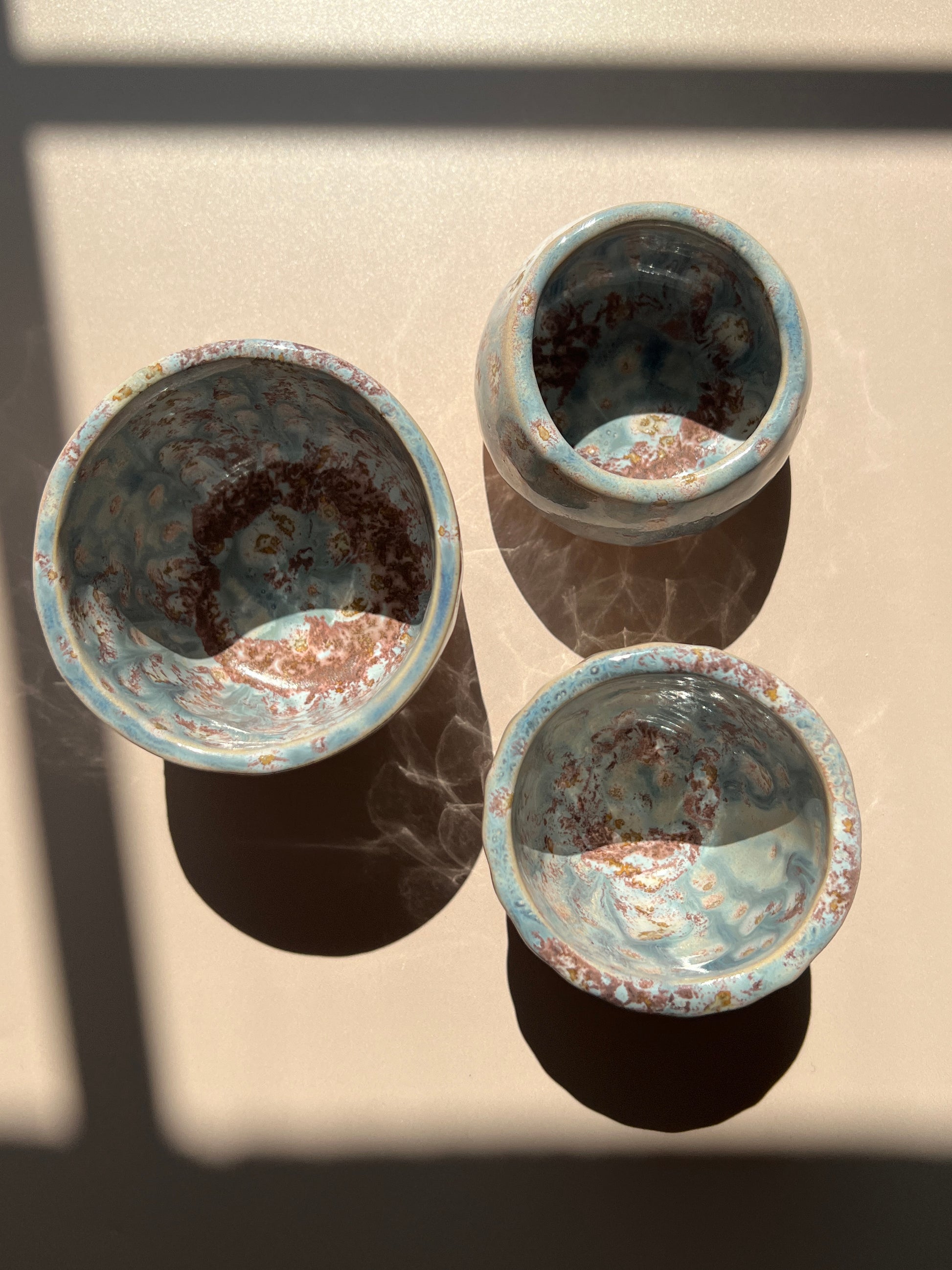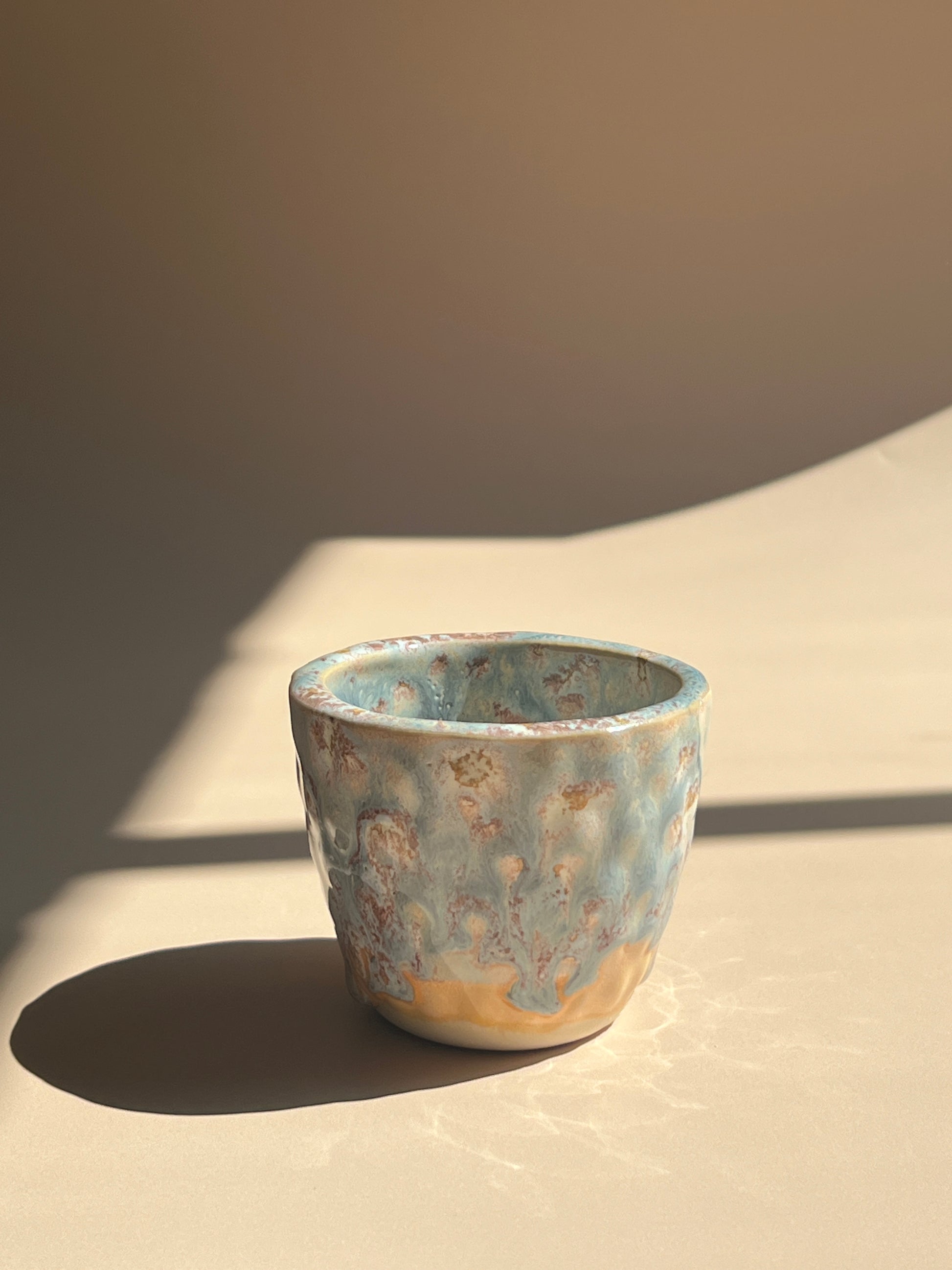 The Sunset Horizon Ripple Mug features a gently rippled surface that accentuates its flowing, hand-thrown form. Its glaze blends vibrant blue, soft pink, and warm orange hues in sweeping layers, echoing the colors of a sunset stretching across the horizon. Each mug is finished with delicate, organic transitions between shades, creating a dynamic and painterly effect unique to every piece. This mug brings a touch of artistry and warmth to your daily rituals, making it a standout addition to any collection.