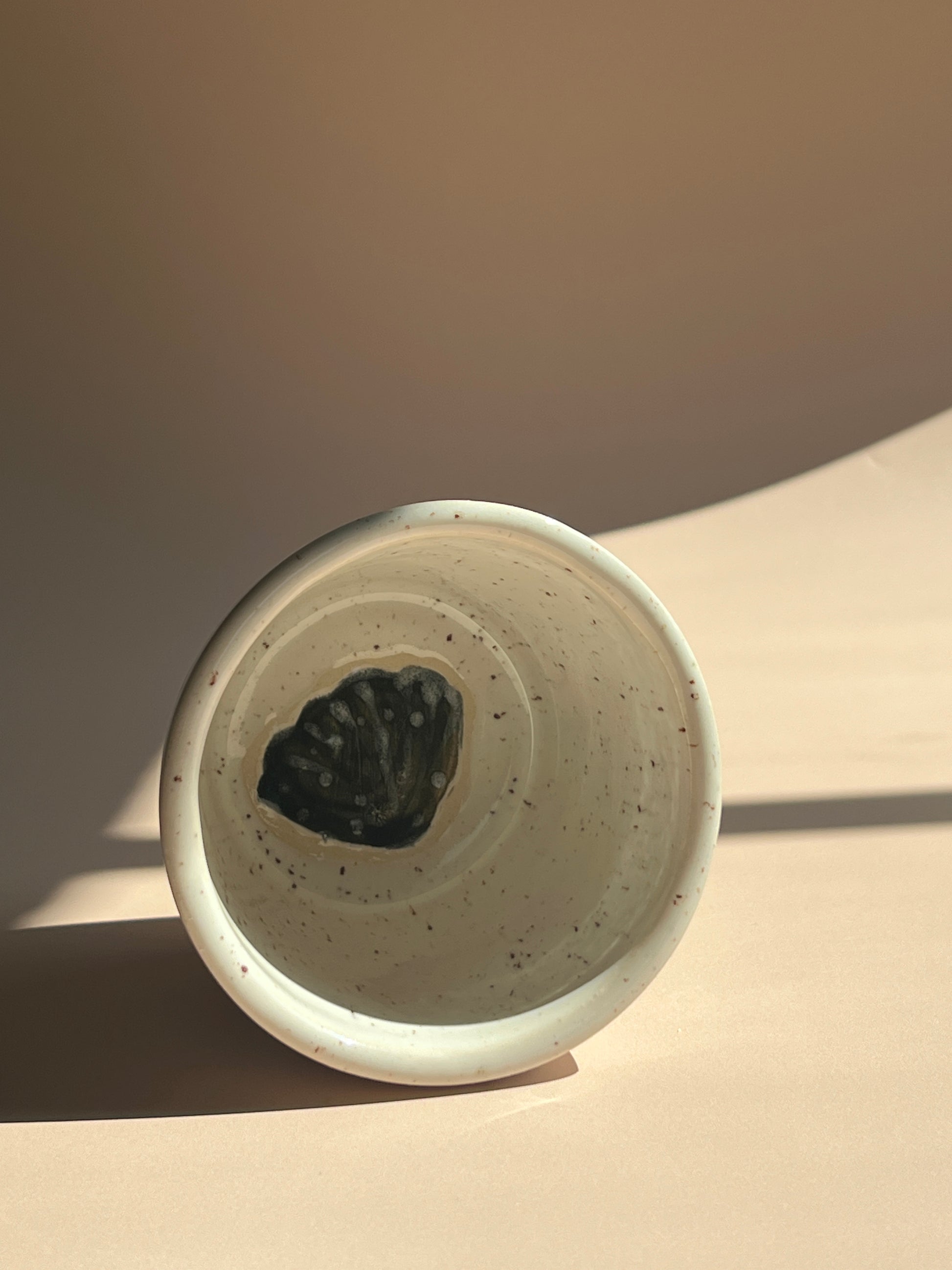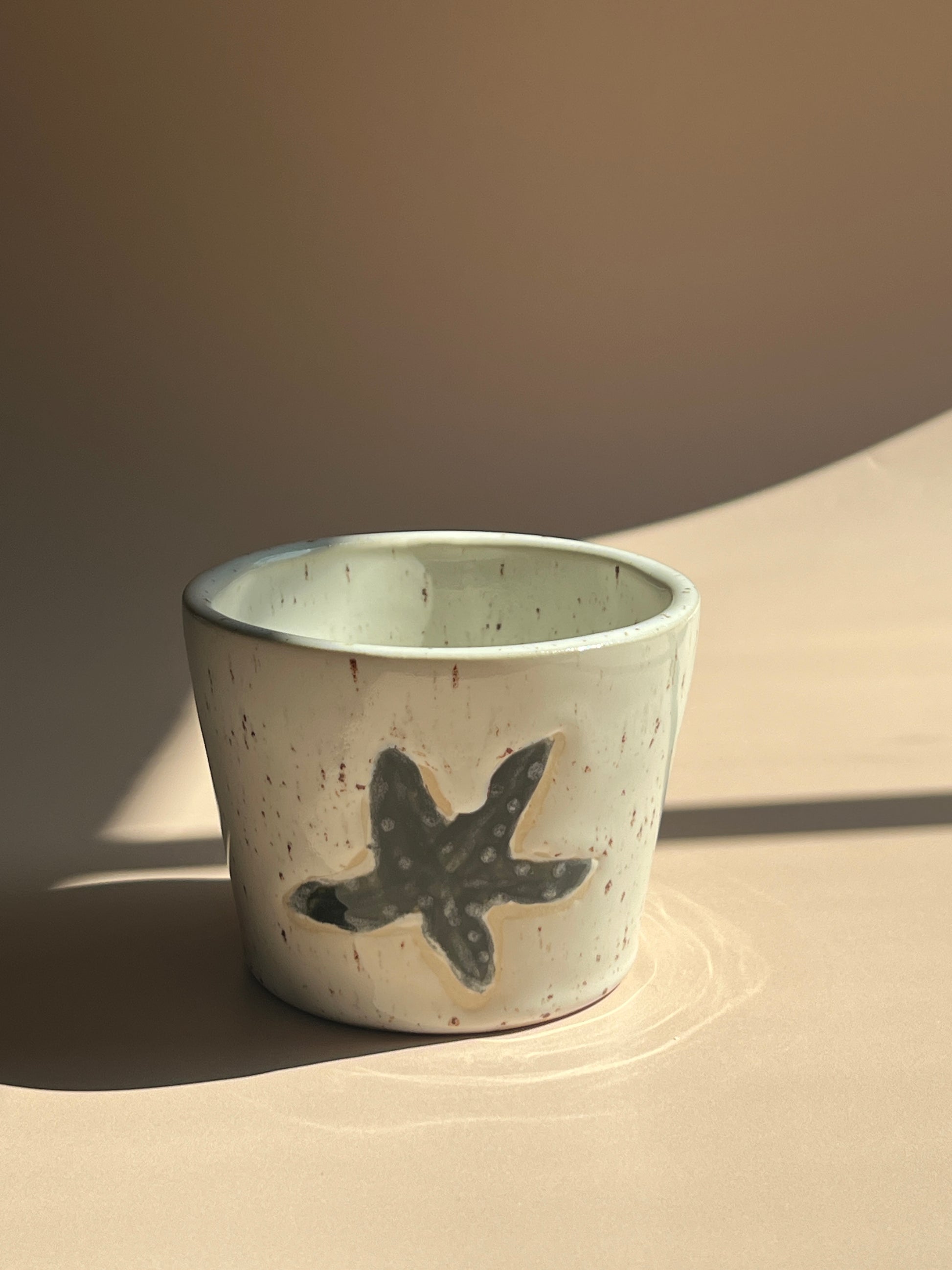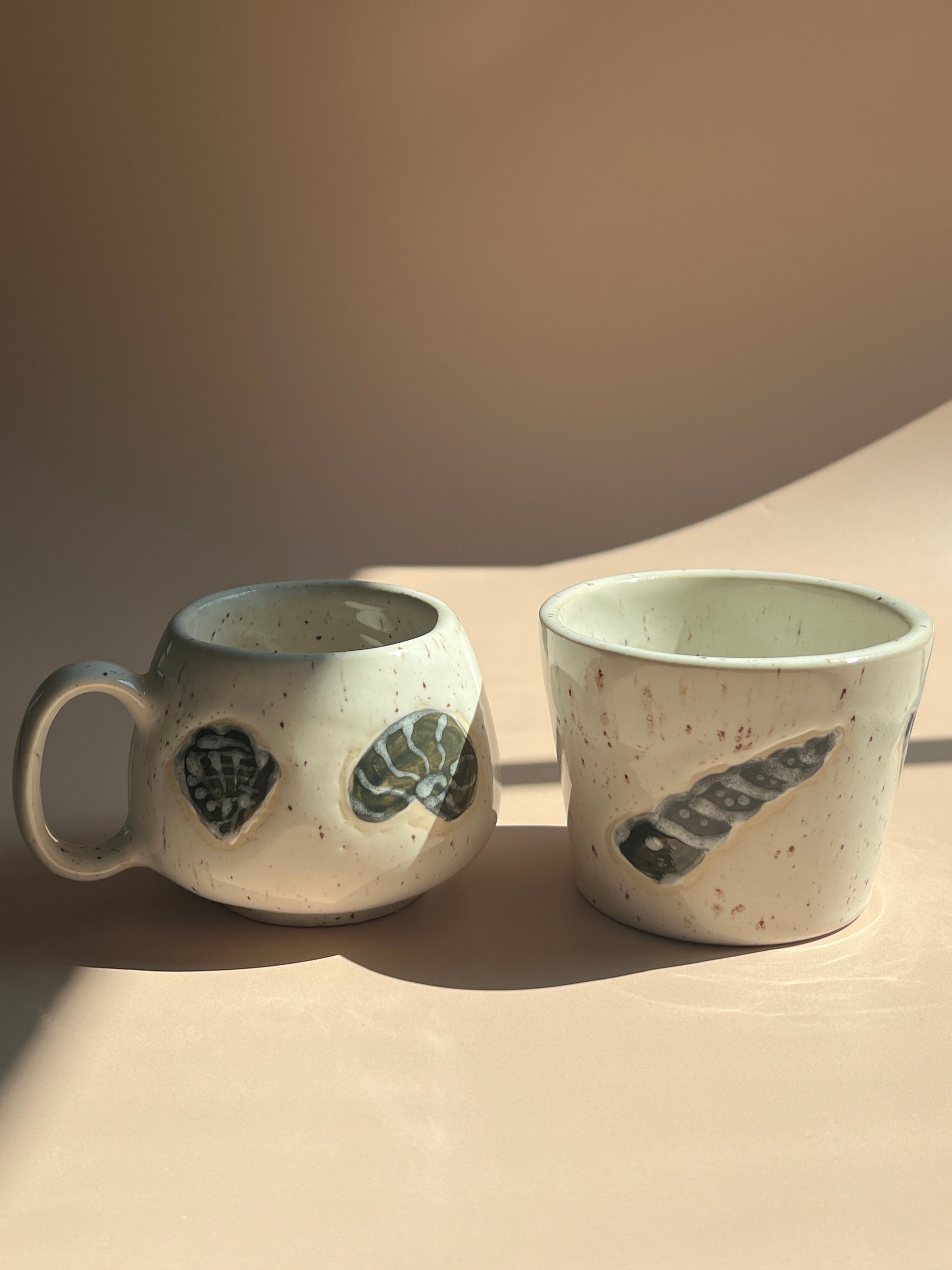 The Tide Treasures Halo Mug is hand-shaped from speckled clay and features a trio of sculpted ocean motifs—a starfish, spiral shell, and scallop—encircling the mug like a halo. Each motif stands out in soft blue-gray tones against the natural clay. Subtle glaze variations and occasional unglazed spots highlight its unique, artisanal character, echoing the organic beauty of seaside finds.